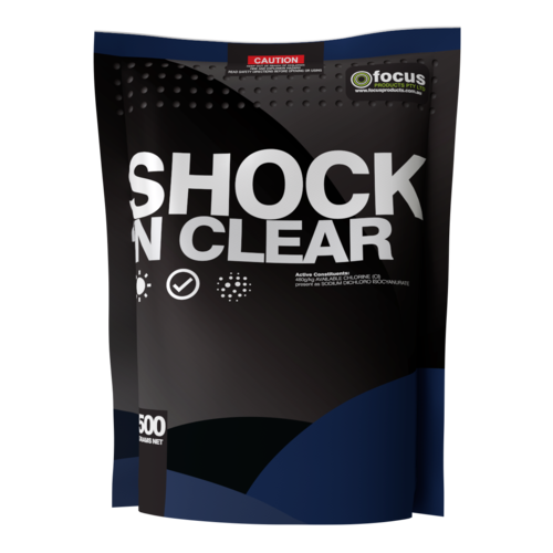 Focus Shock n Clear is a unique and conveniently packaged pool chemical which combines chlorine and oxidiser to boost chlorine level as well as a gentle clarifier within one operation.